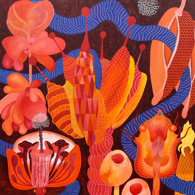 Throughout my life, nature has provided a haven in which to lose myself. My work not only celebrates the brilliance of nature, it also provides entry for my imagination to a world where I can reconfigure natural forms, both terrestrial and marine. This reinterpretation facilitates the creation of completely new DNA structures, a rare evolution of species from the beauty of the natural environment. While researching for this exhibition I visited many different gardens, art galleries, libraries and museums. I kept imagining how the portraits and human bodies featured in these historical masterpieces might look like morphed into my very own DNA organic forms and shapes. I began to consider how bodies draped in cloth could become something else, perhaps hanging or upside down. Taking the human form and re-interpreting those shapes into my own organic plant DNA, each painting holds a complete universe within its chromatic range. Although the research for this show came from many different sources, it is the link and range of hues between each universe that makes CHROMA a unique and synergistic celebration of form and colour. In CHROMA, colour celebrates nature, bringing joy and, just for a moment, the possibility that we may forget everything else that is going on in the world.